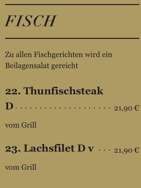 Selbst gemachte Paste mit speziellen Soßen wie Tagliolini Aw, Ah, C mit Parmesankäse und schwarzen Trüffeln, Linguine Aw, Ah, C mit Scampi in Weißwein-Tomatensauce, Tortelloni Aw, Ah, C mit Lachs und Steinpilzen usw.